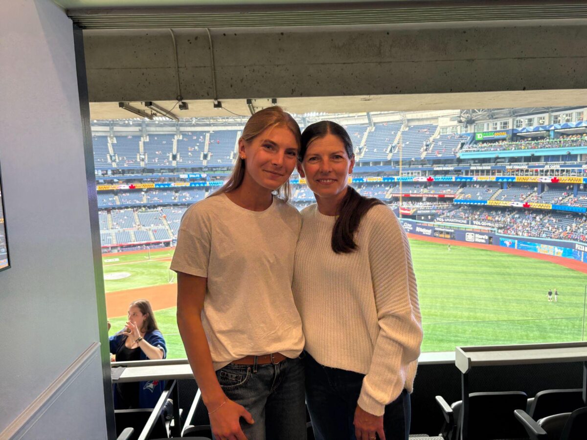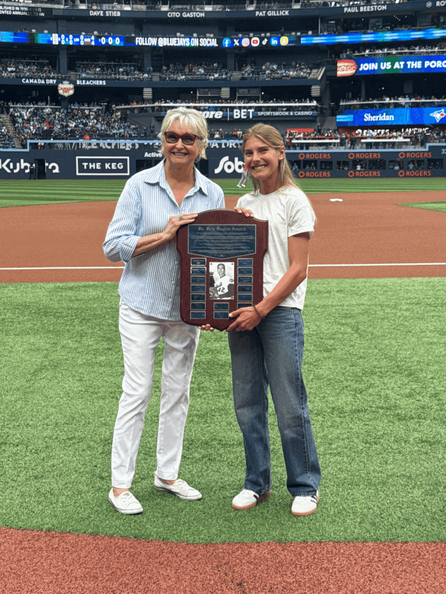 Rona Taylor presenting Kyla Twinem with the Dr. Ron Taylor Award plaque during the pre-game ceremony at Rogers Centre. (Photo by Madeline Cholette/The Sheridan Sun)