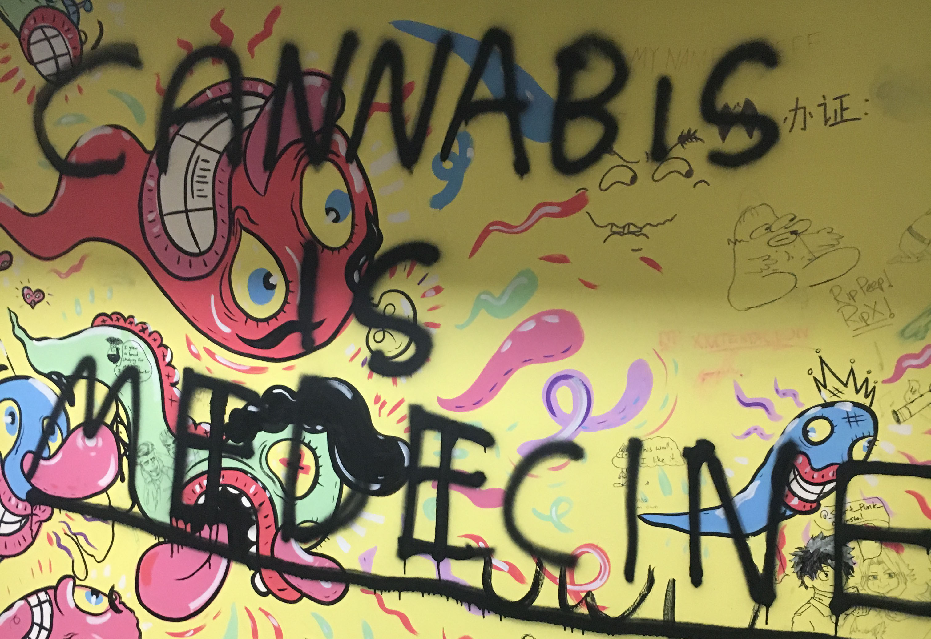 “cannabis is medicine” spray painted on the wall in front of other art. Photo Credit: Joe Blow